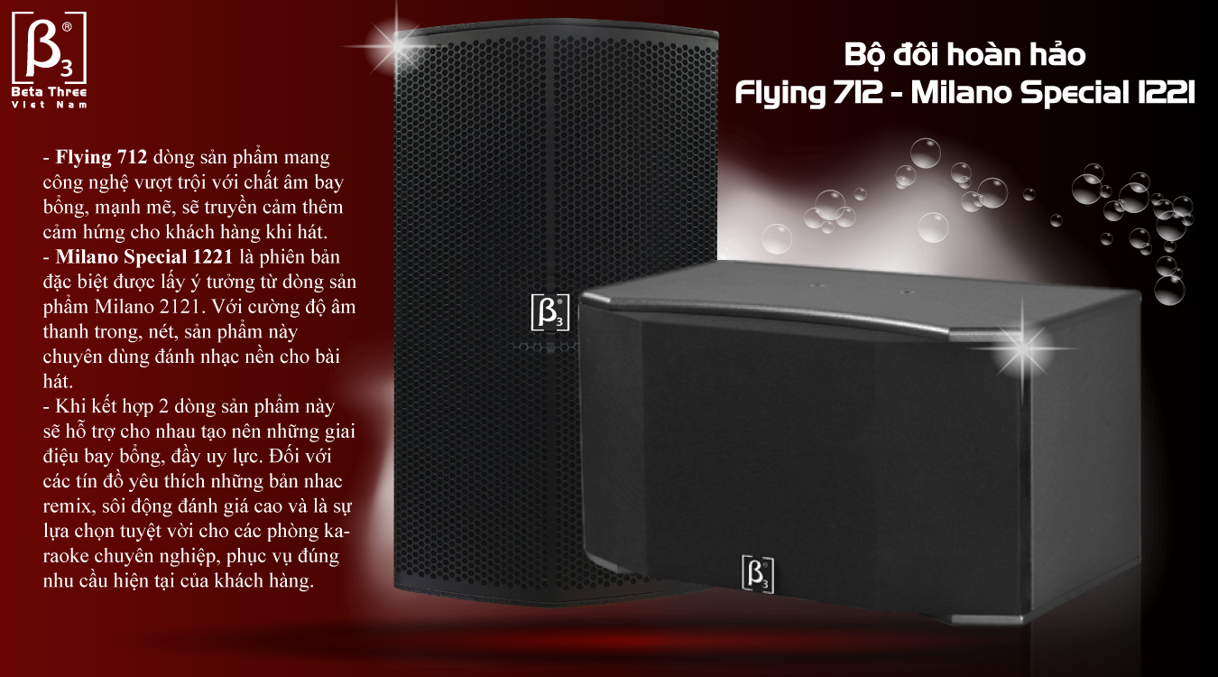 Trong đó, có một bộ đôi sản phẩm khi kết hợp với nhau tạo ra những chất âm cực kỳ hoàn hảo mà Beta Three muốn giới thiệu đến khách hàng đó là bộ đôi Milano Special 1221 và Flying 712. Đây là 2 dòng loa được Beta Three phát triển vào đầu năm 2017, mang trong mình những công nghệ hiện đại nhất hiện nay. Với chất âm mạnh mẽ, uy lực Milano Special 1221 chuyên dùng cho các dòng nhạc mạnh và dùng đánh nhạc nền cho các bài hát được yêu chuộng hiện nay.